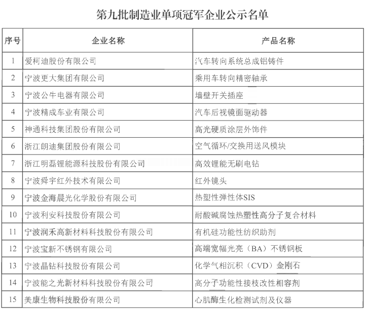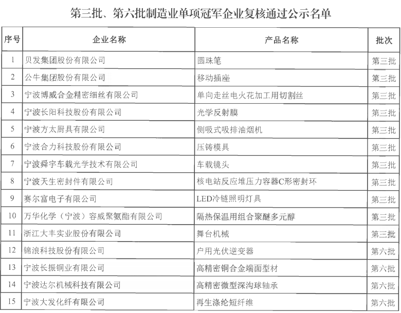 同時,我會共有5家會員企業通過“第三批、第六批制造業單項冠軍企業復核”:貝發集團股份有限公司的圓珠筆、公牛集團股份有限公司的移動插座、寧波方太廚具有限公司的側吸式吸排油煙機、寧波杜亞機電技術有限公司的管狀電機、寧波弘訊科技股份有限公司的塑機控制系統。